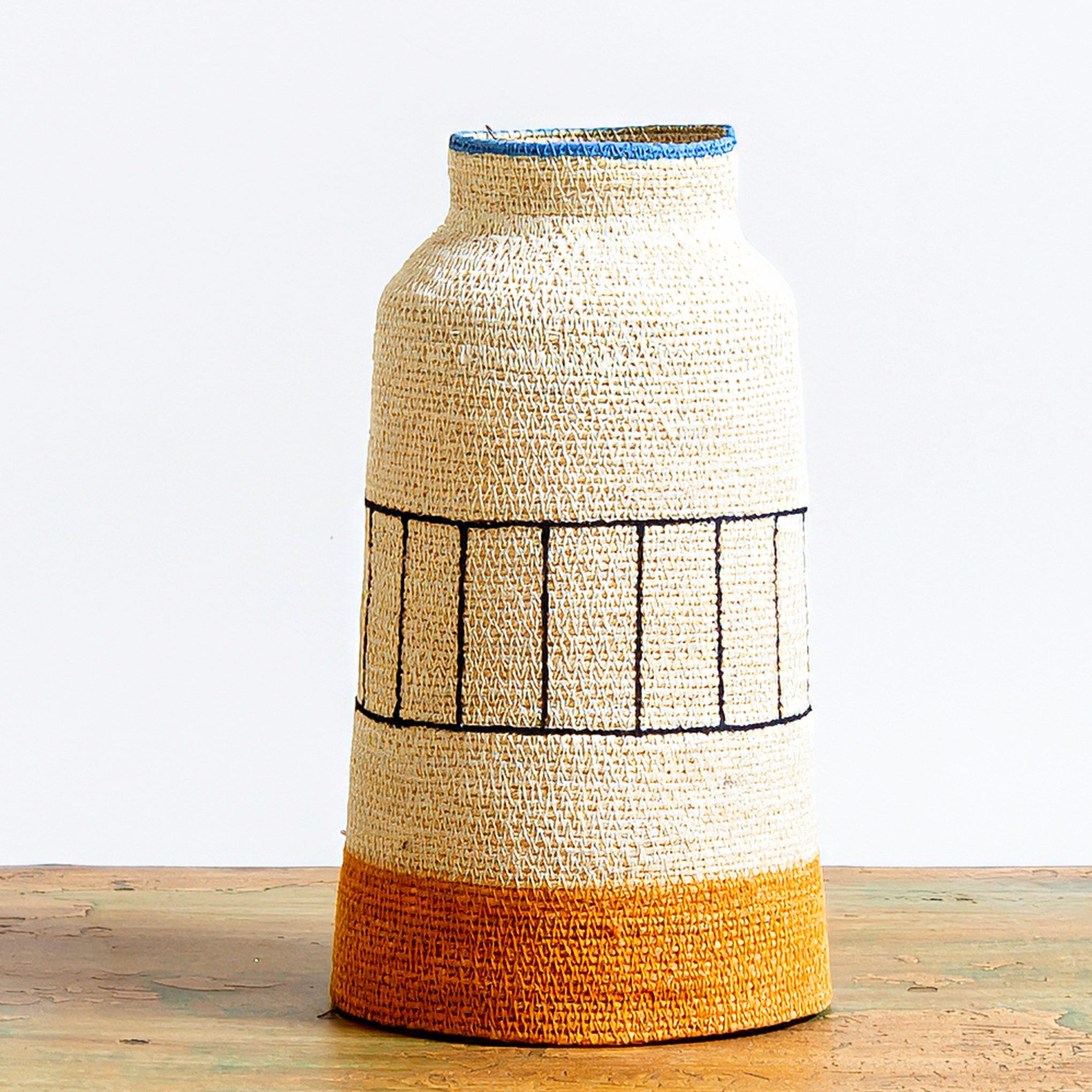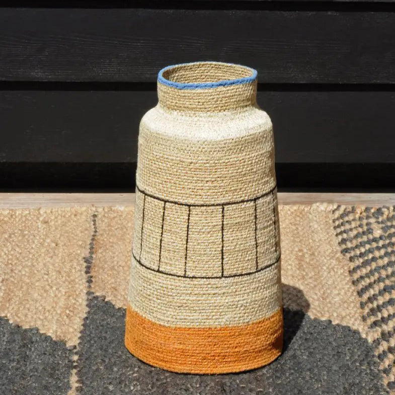 Agrega un toque artesanal y natural a tu hogar con este cesto hecho a mano por pequeños artesanos y teñido con tintes naturales. Realizado con hilo teñido en color almendra y una banda forrada pintada con pespunte overlock en la parte superior y una base naranja.
