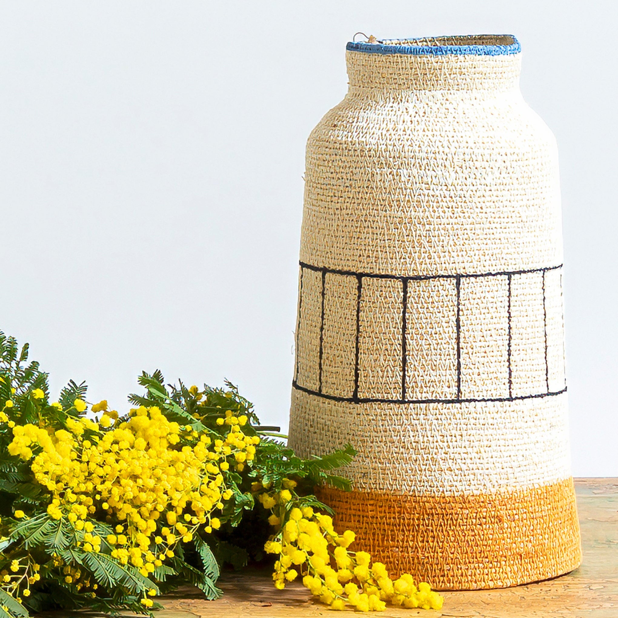 Se puede utilizar simplemente para decorar una cómoda o estantería, como jarrón con flores naturales si dentro introduces un jarrón de cristal sencillo o con flores y ramaje seco para darle un toque orgánico y acogedor a cualquier estancia. Combina fenomenal con las cestas con tapa en las mismas tonalidades.