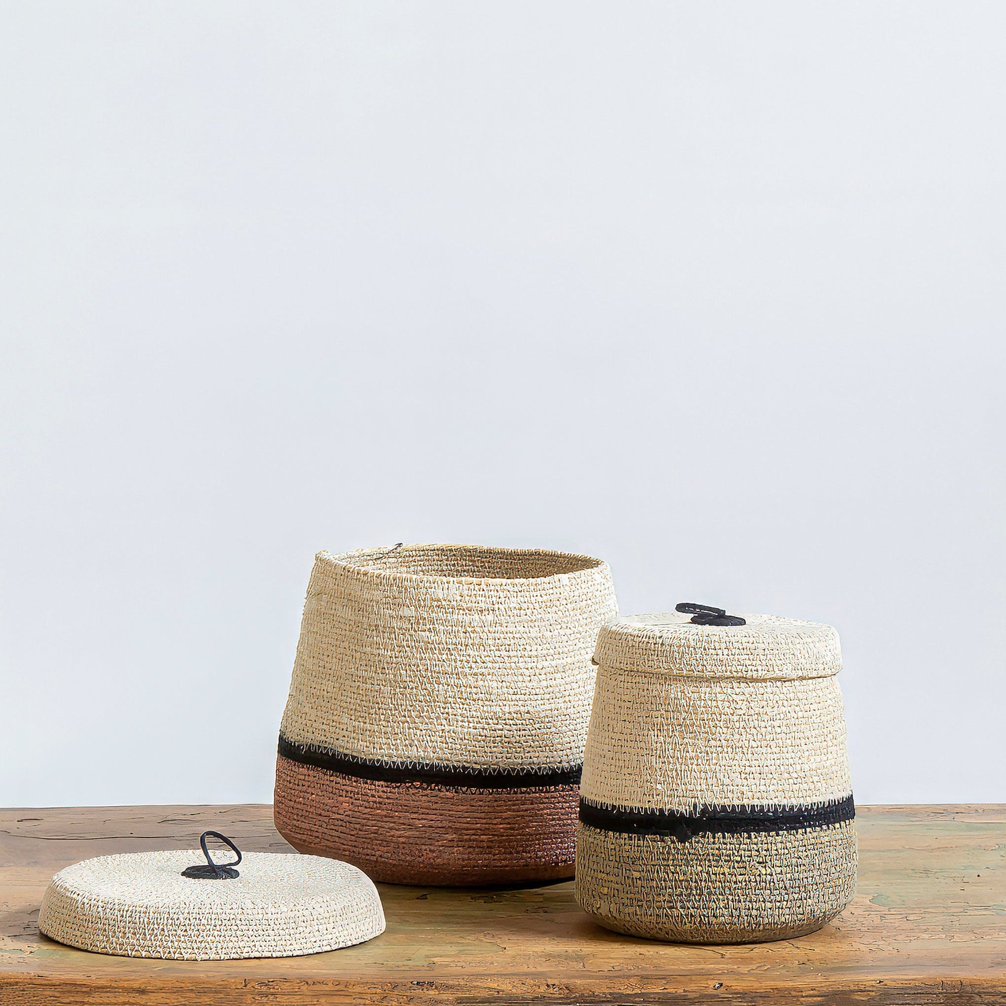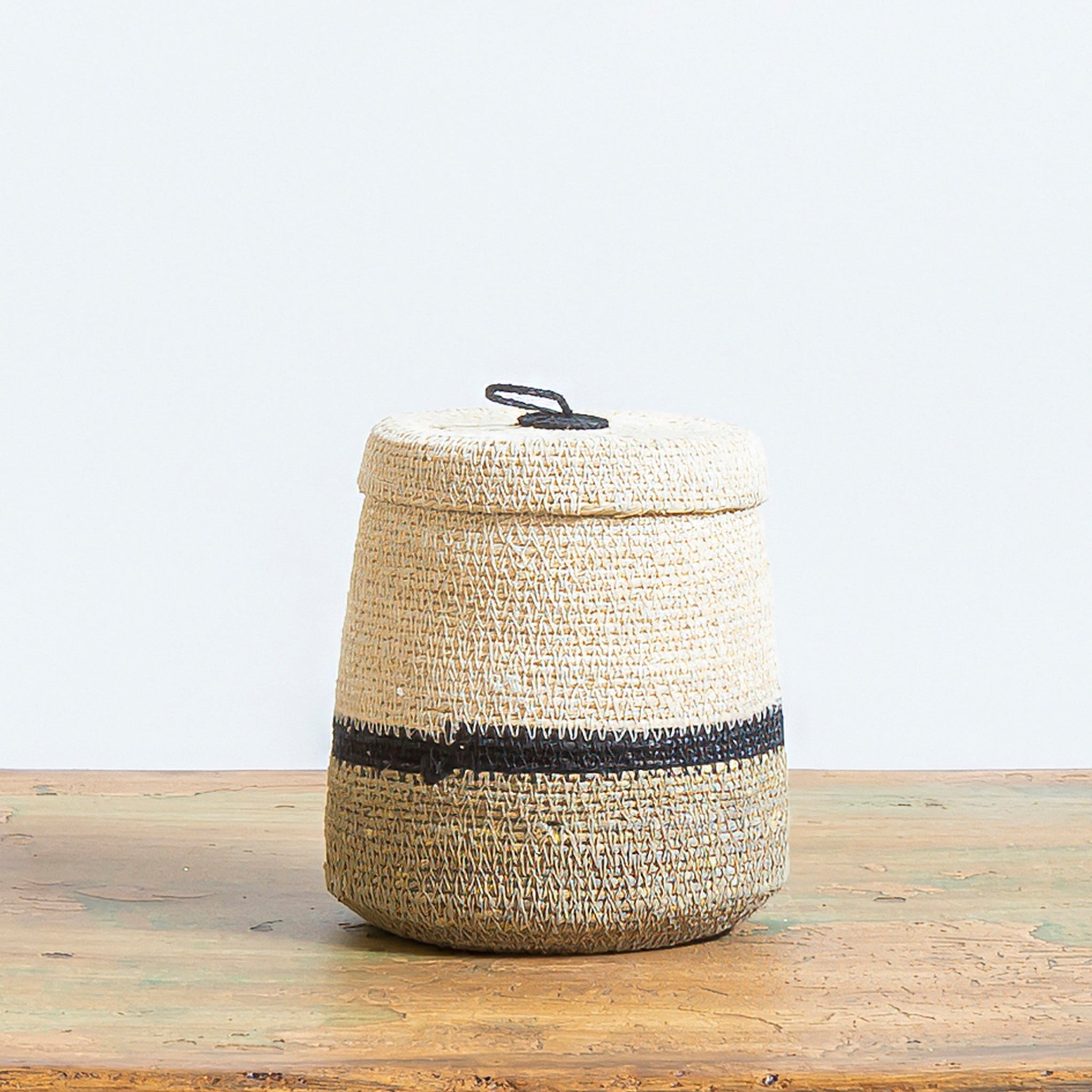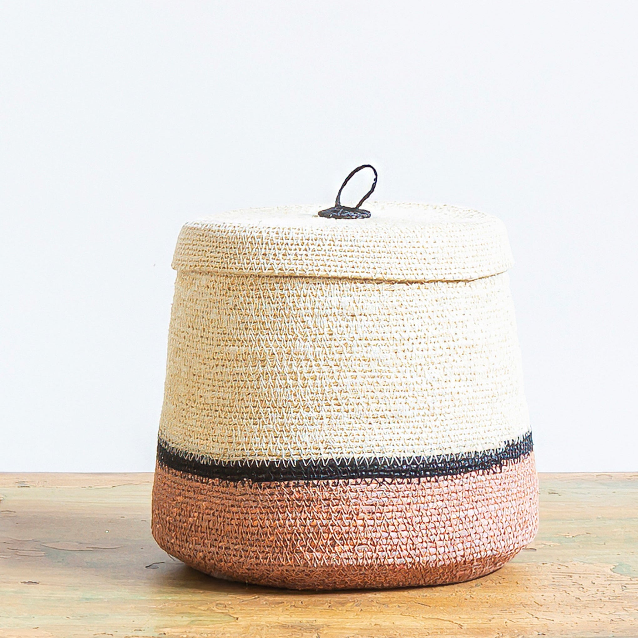 Agrega un toque artesanal y natural a tu hogar con estas cestas con tapa hechas a mano por pequeños artesanos y teñidas con tintes naturales. Su diseño único incluye una raya pintada a mano en horizontal.
