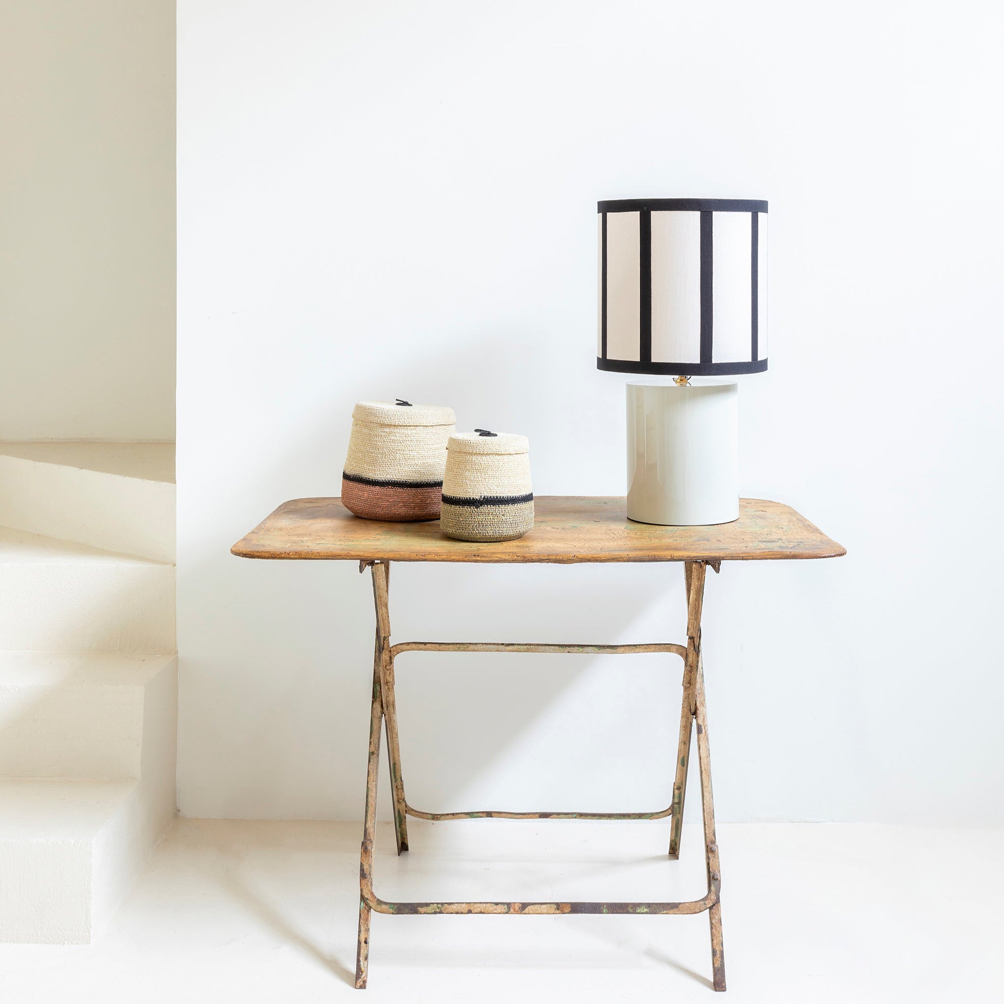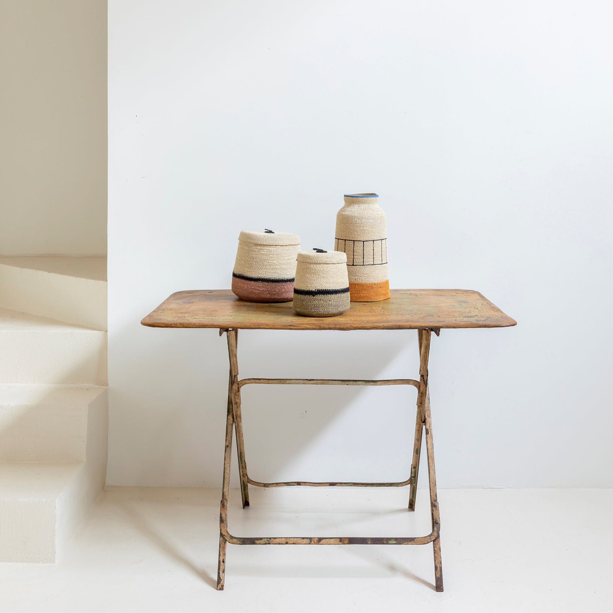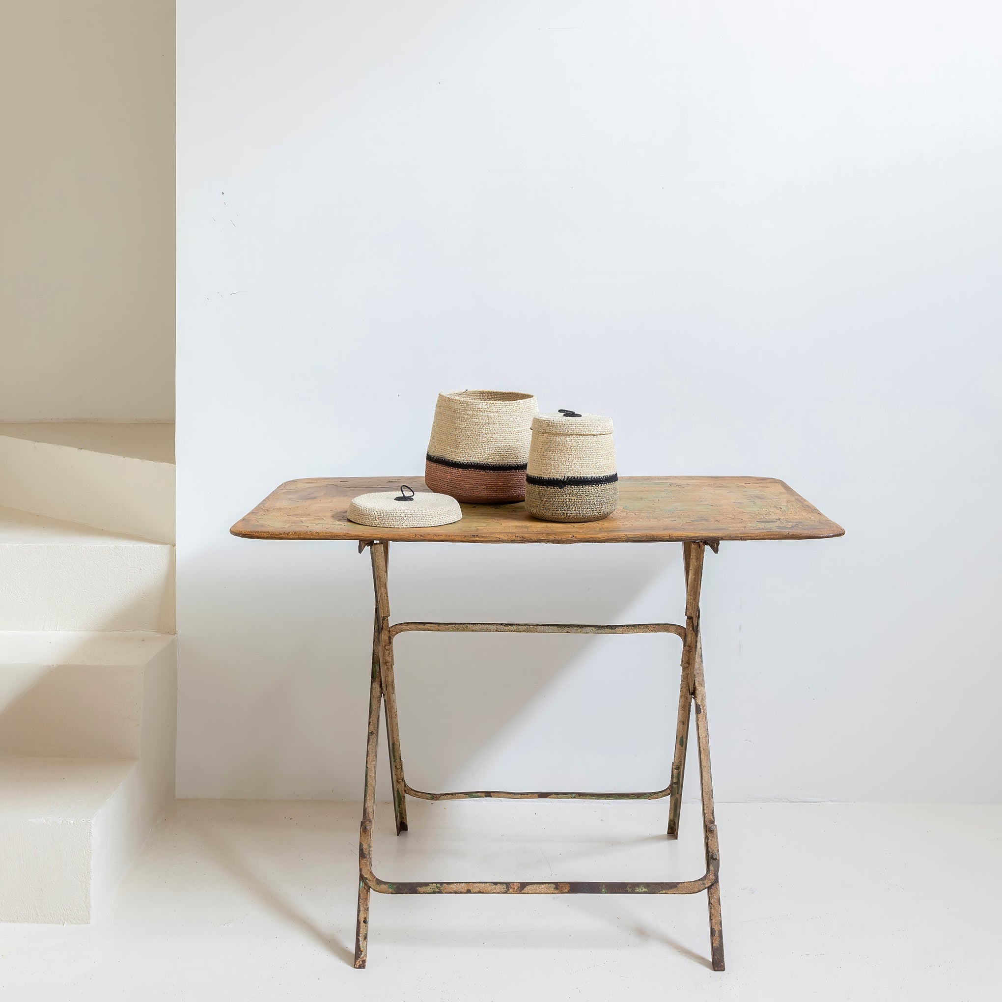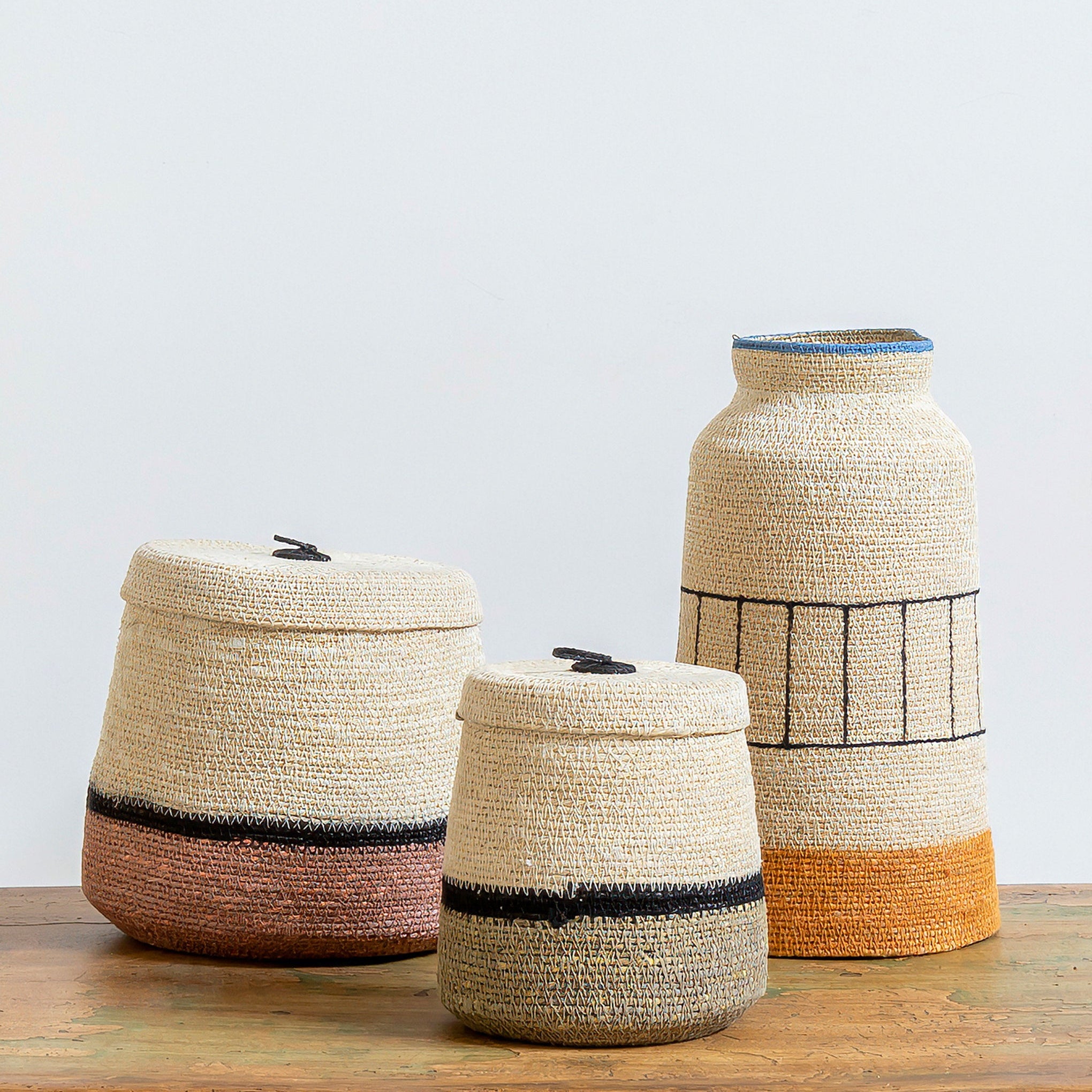 Agrega un toque artesanal y natural a tu hogar con estas cestas con tapa hechas a mano por pequeños artesanos y teñidas con tintes naturales. Su diseño único incluye una raya pintada a mano en horizontal.