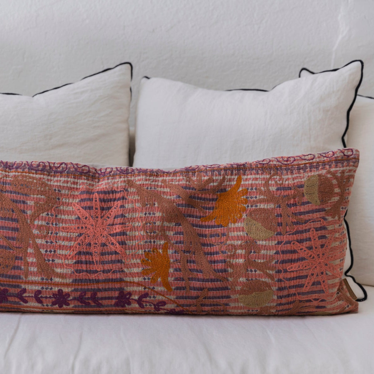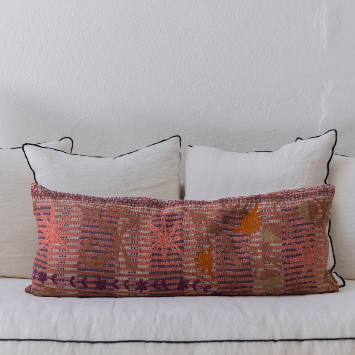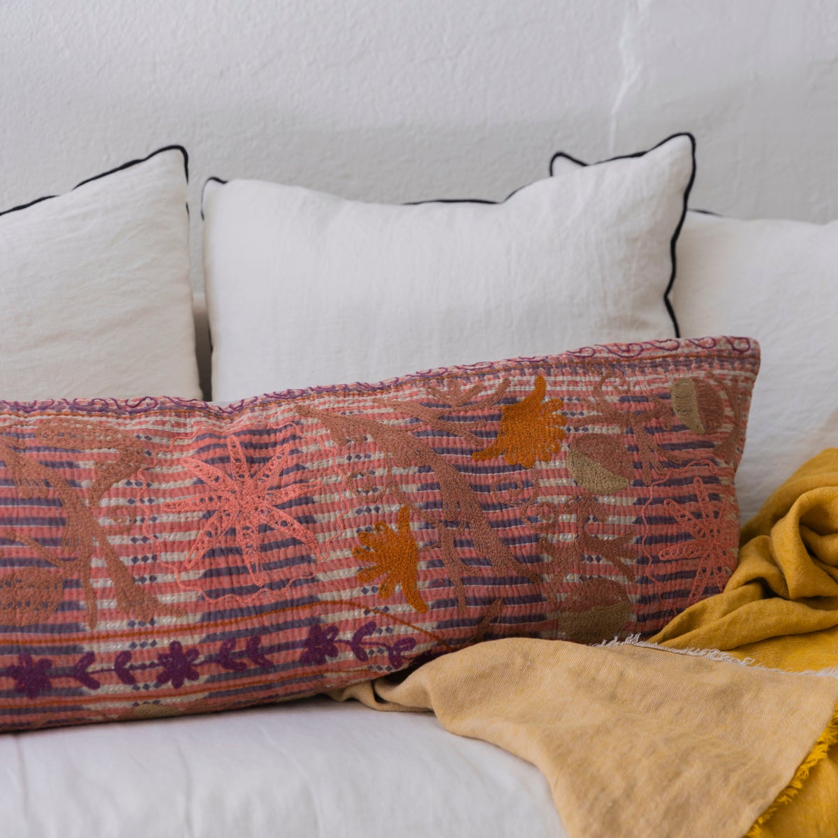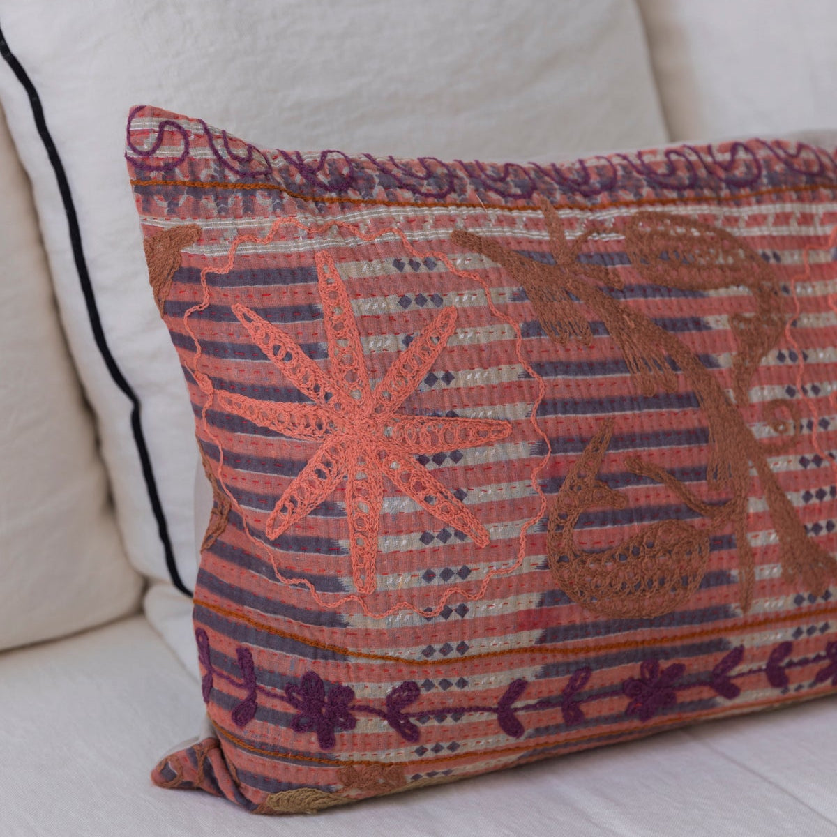 Cojín de suzani indio vintage reciclado con diseño intencionalmente imperfecto y parches decorativos.