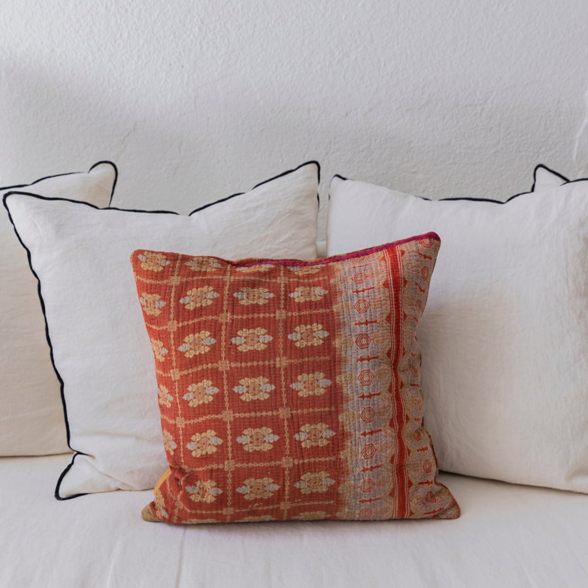 Pertenece a nuestra colección de cojines exclusivos Indios. Con detalles de costura Kantha hechos a mano y patrones inusuales, estos cojines no sólo decoran, sino que cuentan una historia de arte textil tradicional de la India. Su estilo desgastado y elegante añade carácter a tu hogar, combinando estética y funcionalidad.