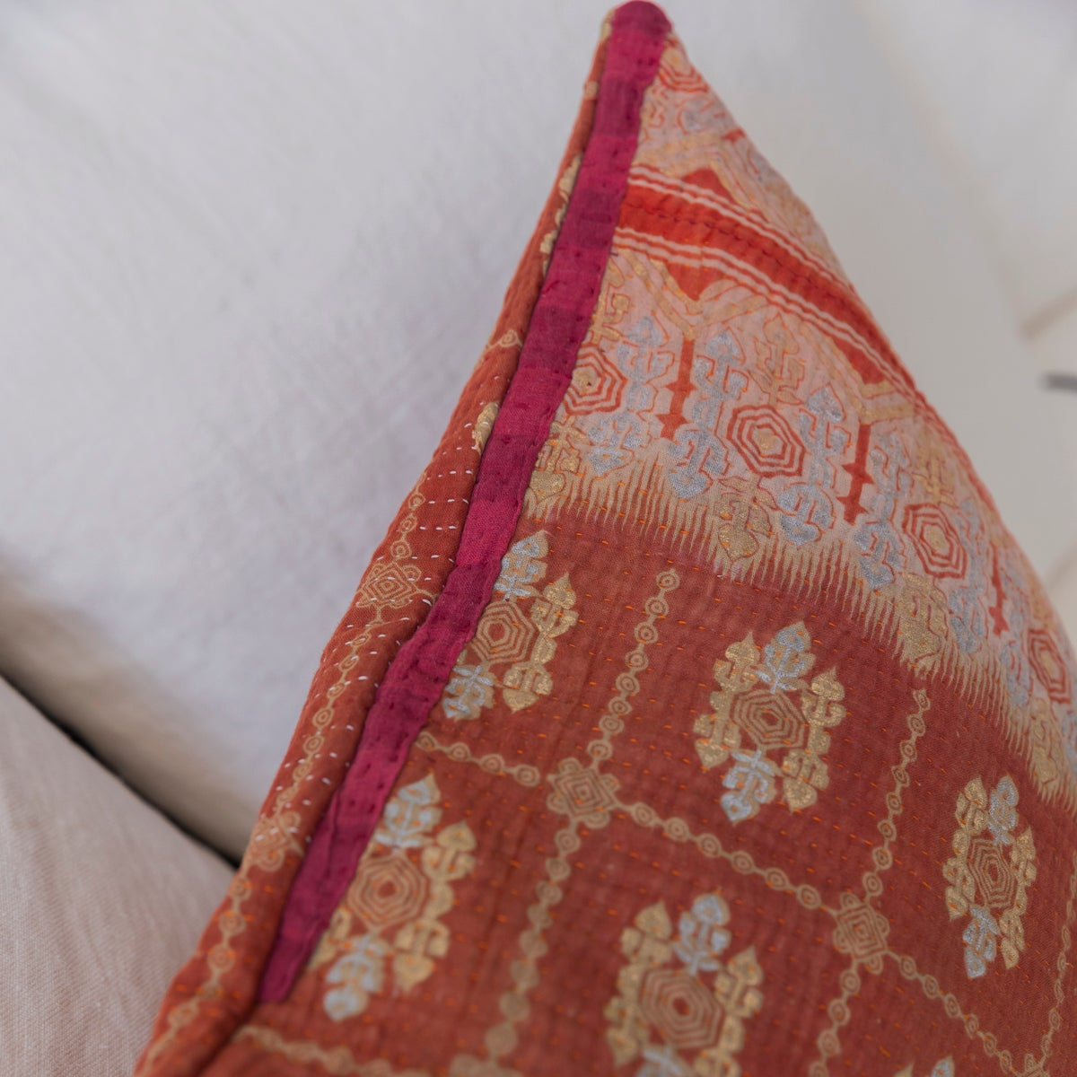 Cojín de sari indio vintage reciclado con diseño intencionalmente imperfecto y parches decorativos.