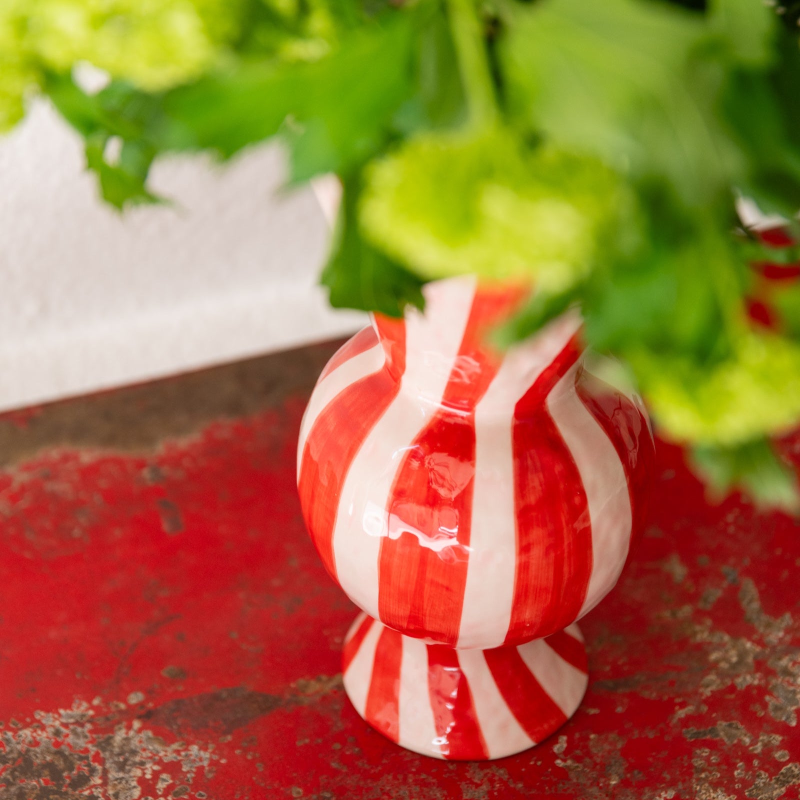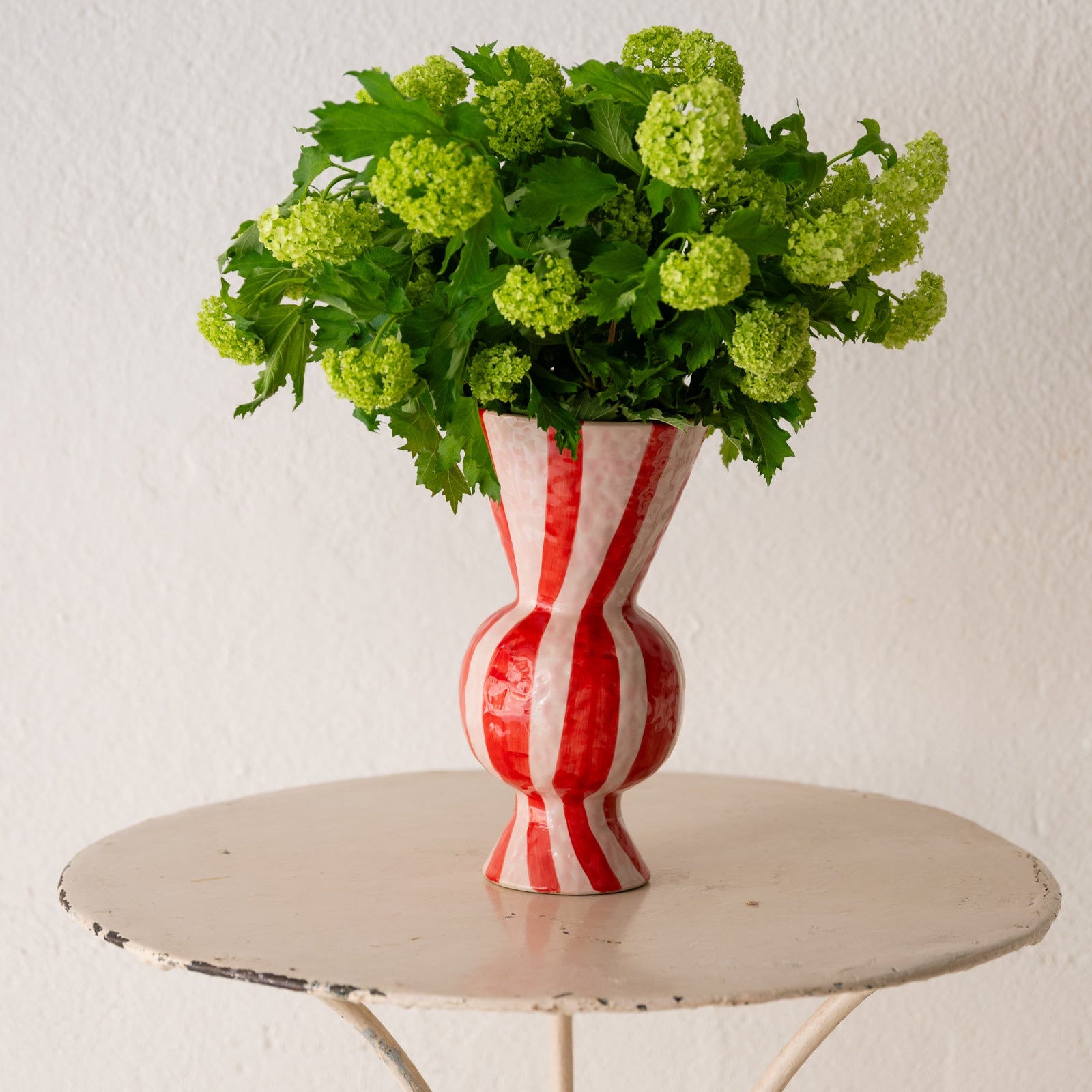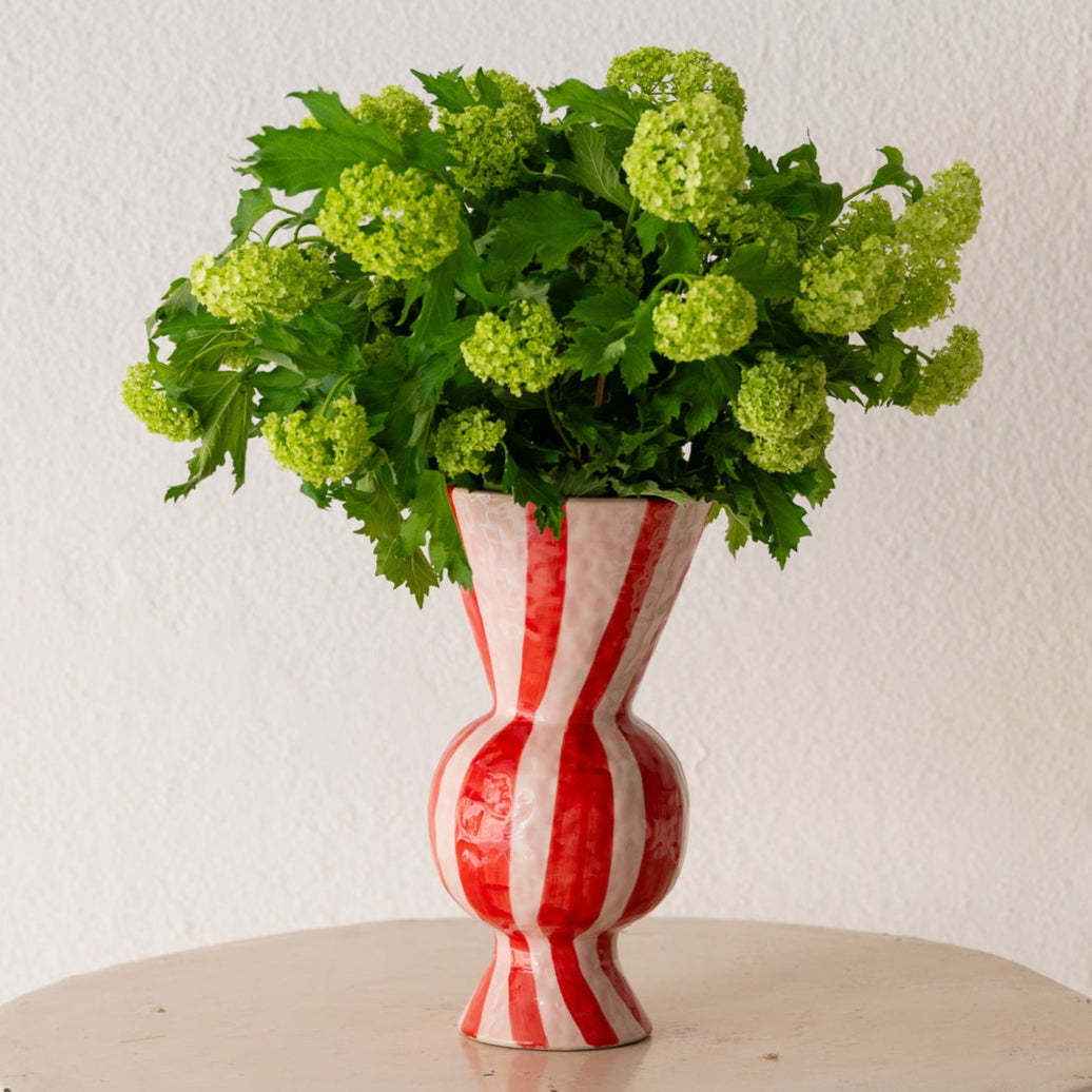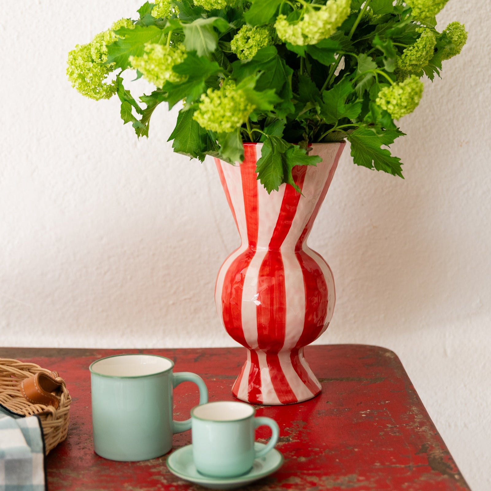 Jarrón grande en gres porcelánico pintado a mano con rayas irregulares en color rojo y fondo blanco roto.