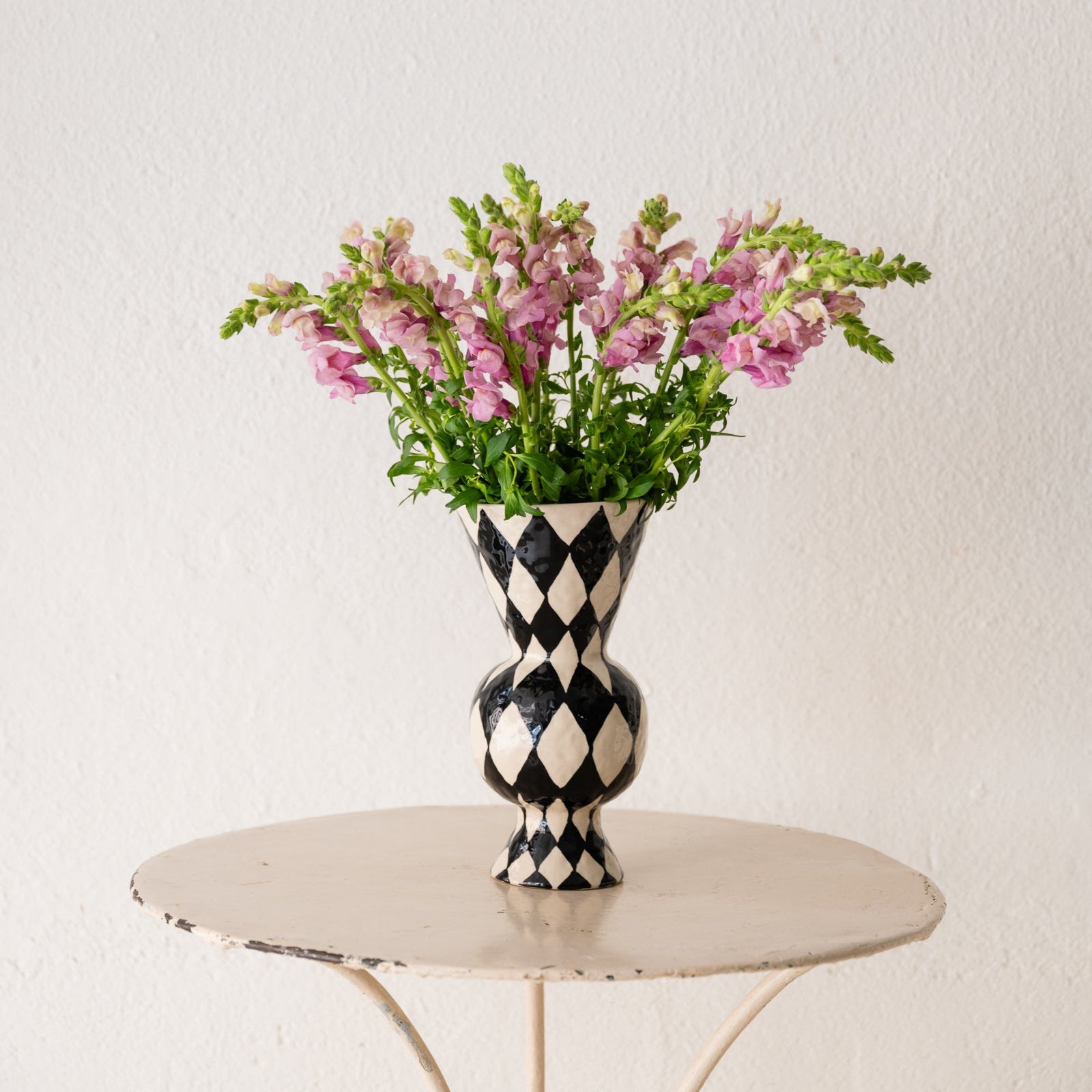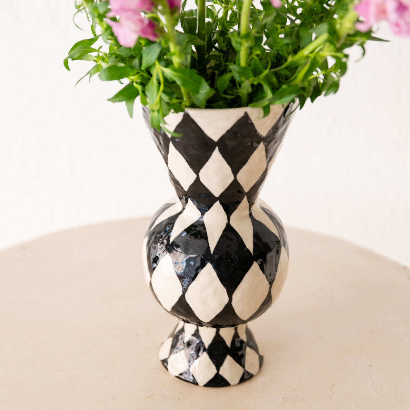 Jarrón grande en gres porcelánico pintado a mano con rombos en color negro y fondo blanco roto.