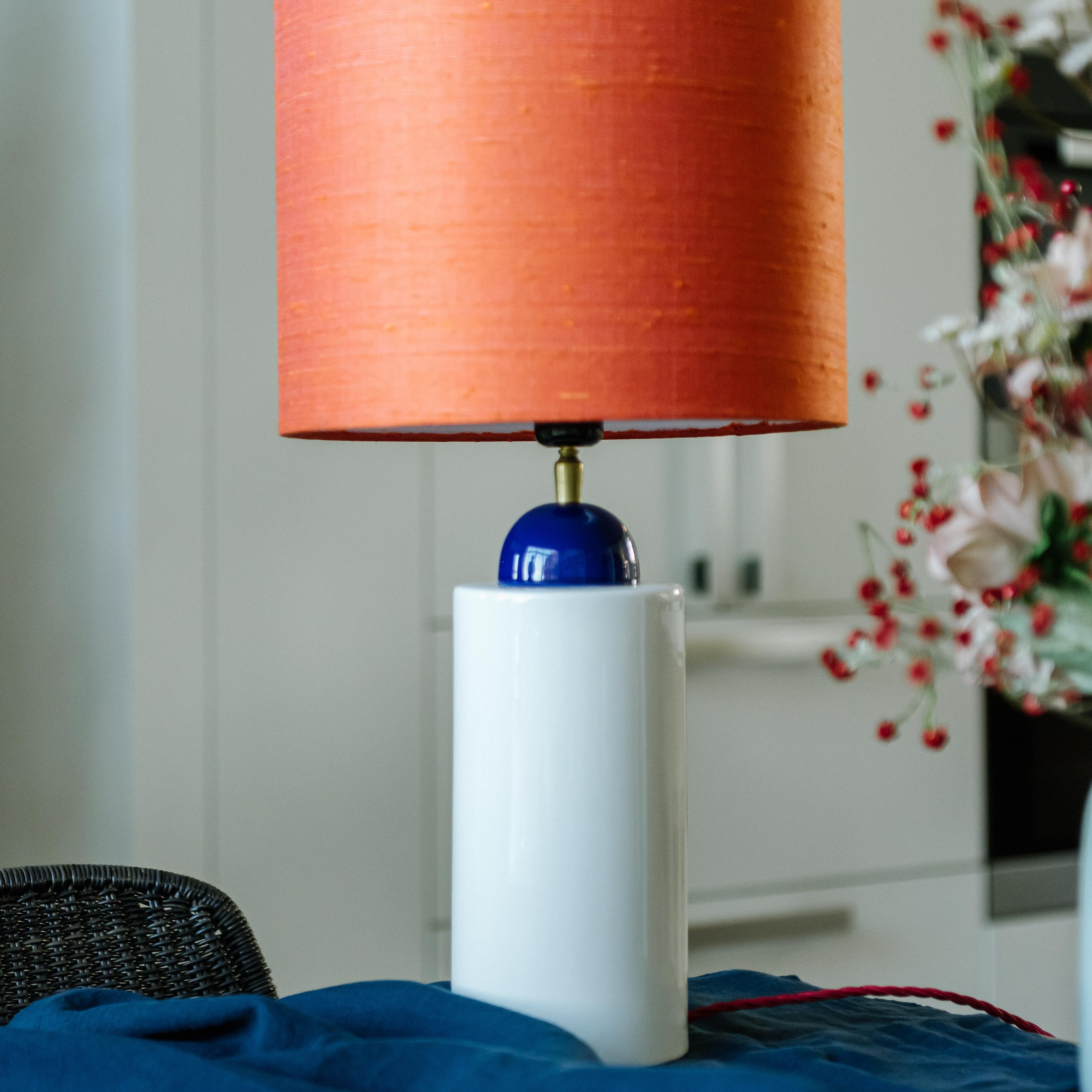 La pantalla es de seda salvaje tejida a mano en color naranja intenso, la base cilíndrica es de cerámica en blanco nórdico con un semicírculo en azul cobalto y el cable de color rojo. Combina fenomenal, si quieres darle un toque de color y alegría, con cualquiera de las otras cinco lámparas de cerámica hechas a mano.