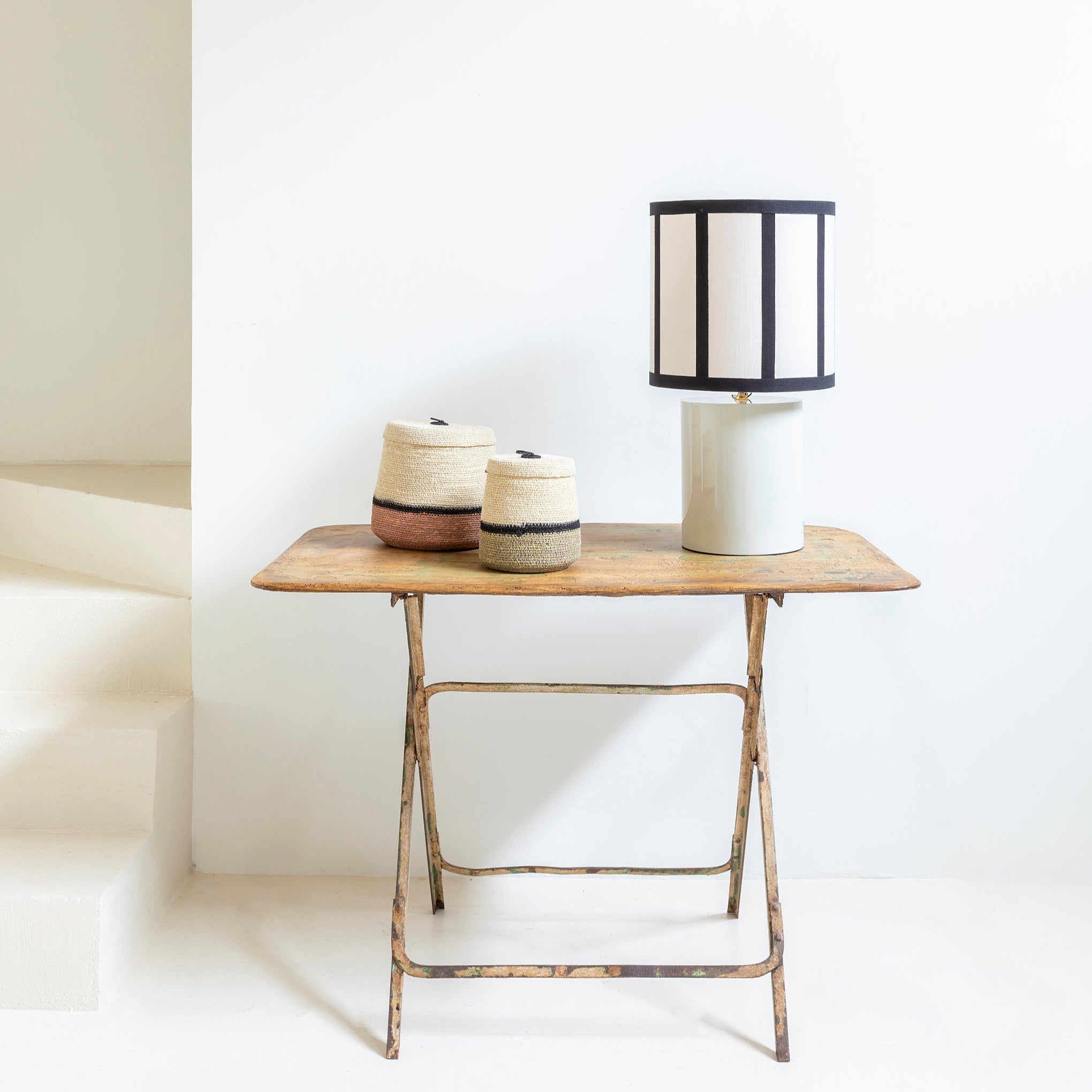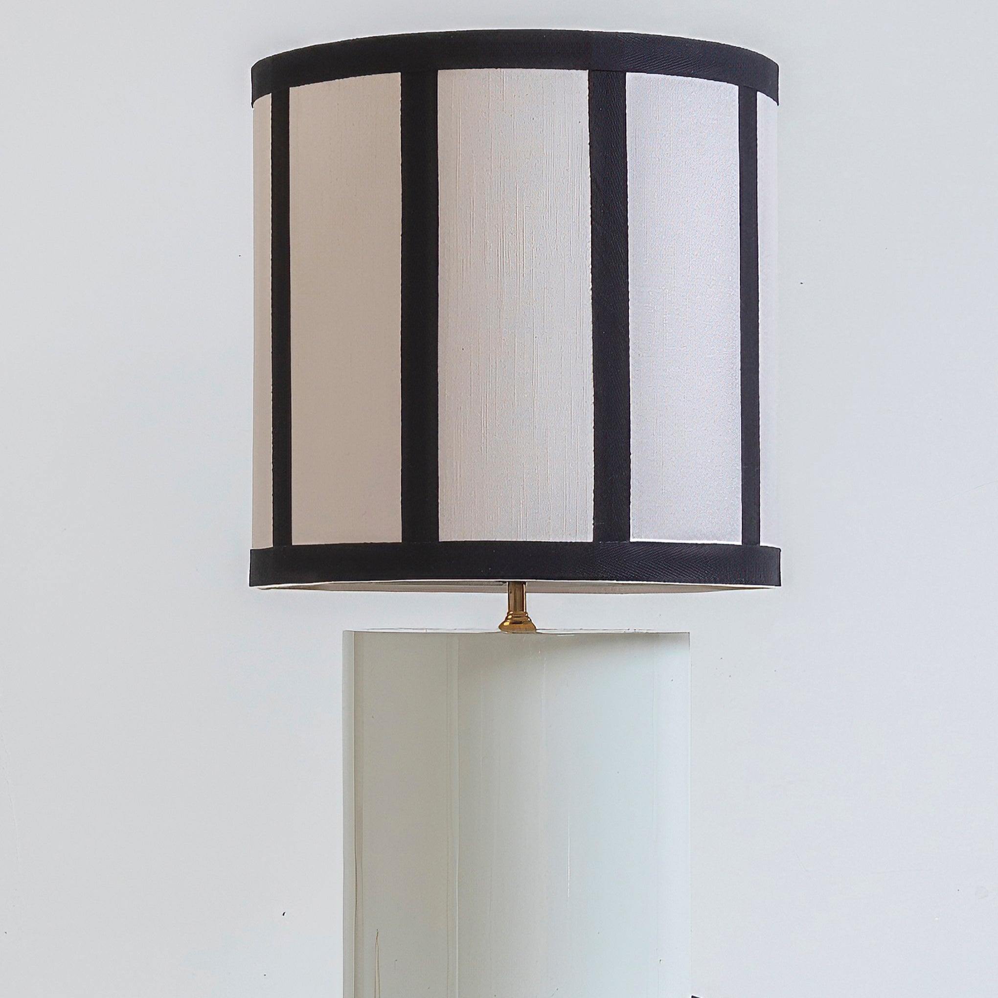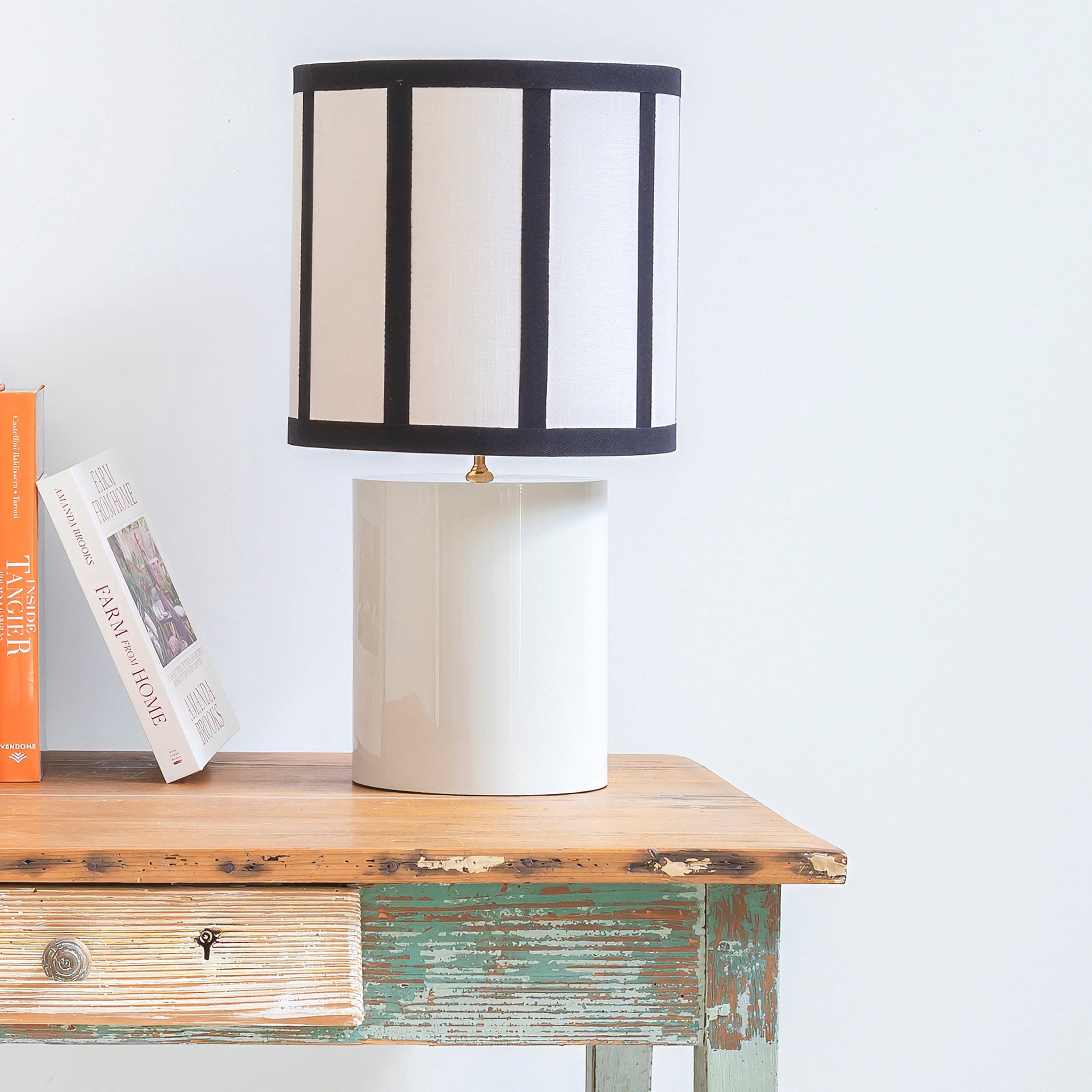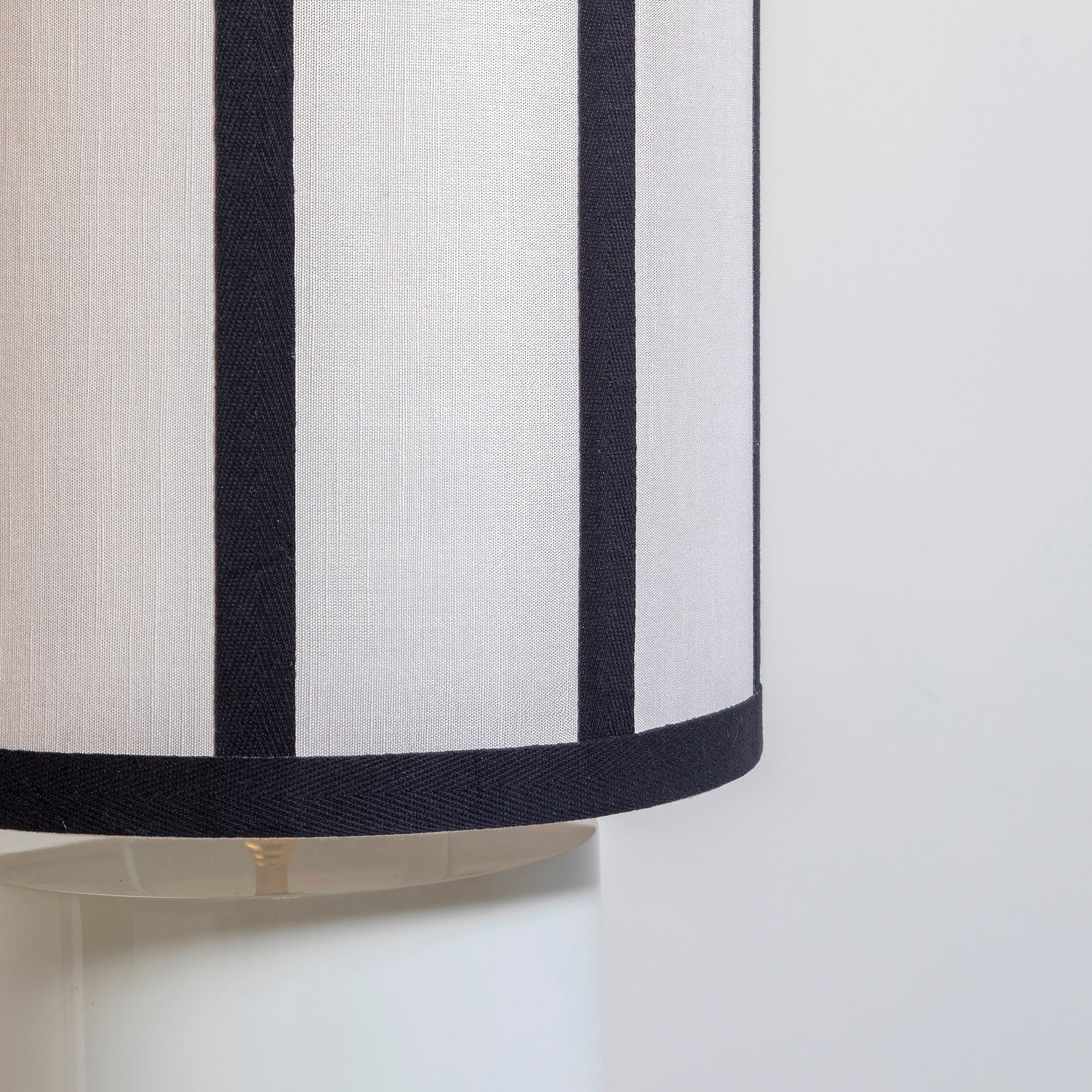 Lámpara de mesa con base cilíndrica blanco arena y pantalla de seda en crudo con rayas negras.