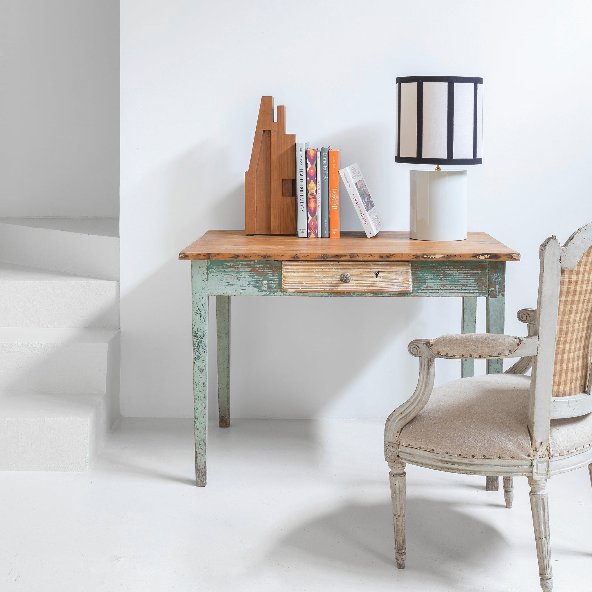 Su base cilíndrica, elaborada en madera lacada con un acabado blanco arena, imita con delicadeza la textura y el brillo de la cerámica, aportando calidez y estilo.