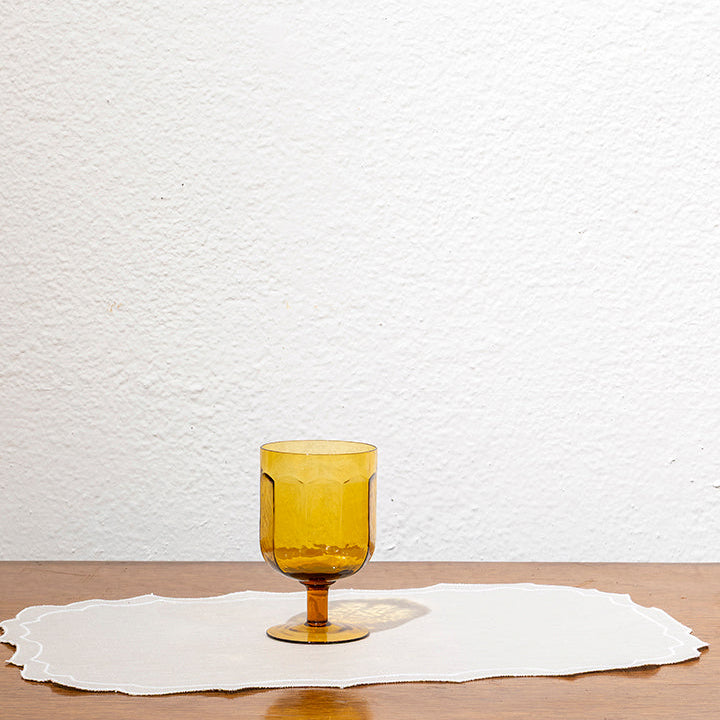 Conjunto de 6 copas fabricadas en vidrio color ámbar transparente y decoradas con una textura efecto martillado que aporta brillo y relieve a la superficie. Su diseño combina funcionalidad y estilo, convirtiéndolas en una pieza cómoda y resistente para el uso diario.