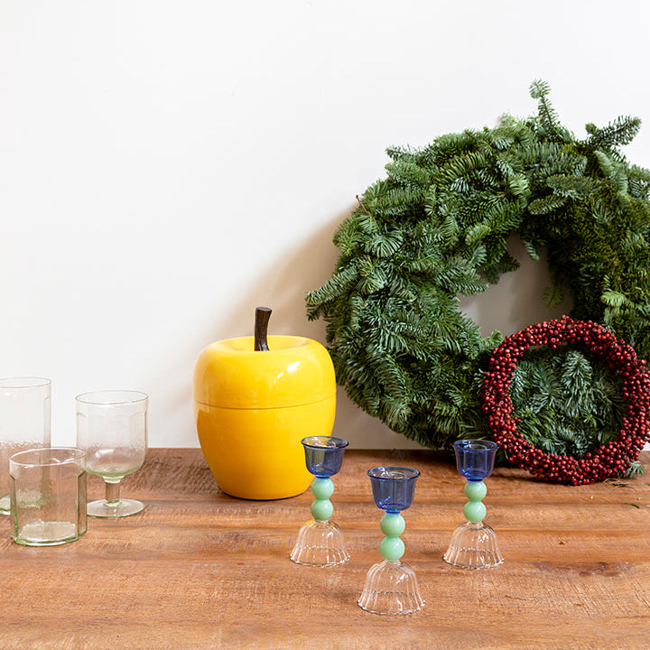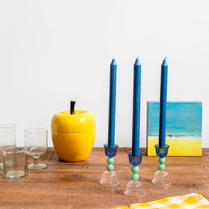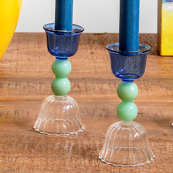 Portavelas de cristal macizo con una base para apoyar en color transparente, seguida de dos perlas en color verde agua y por último una copa en color azul donde se sostiene la vela.