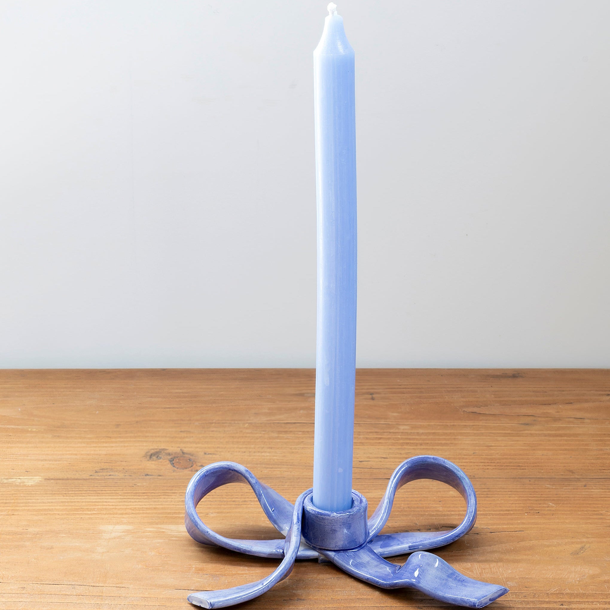 Candelabro de cerámica azul con forma de lazo.