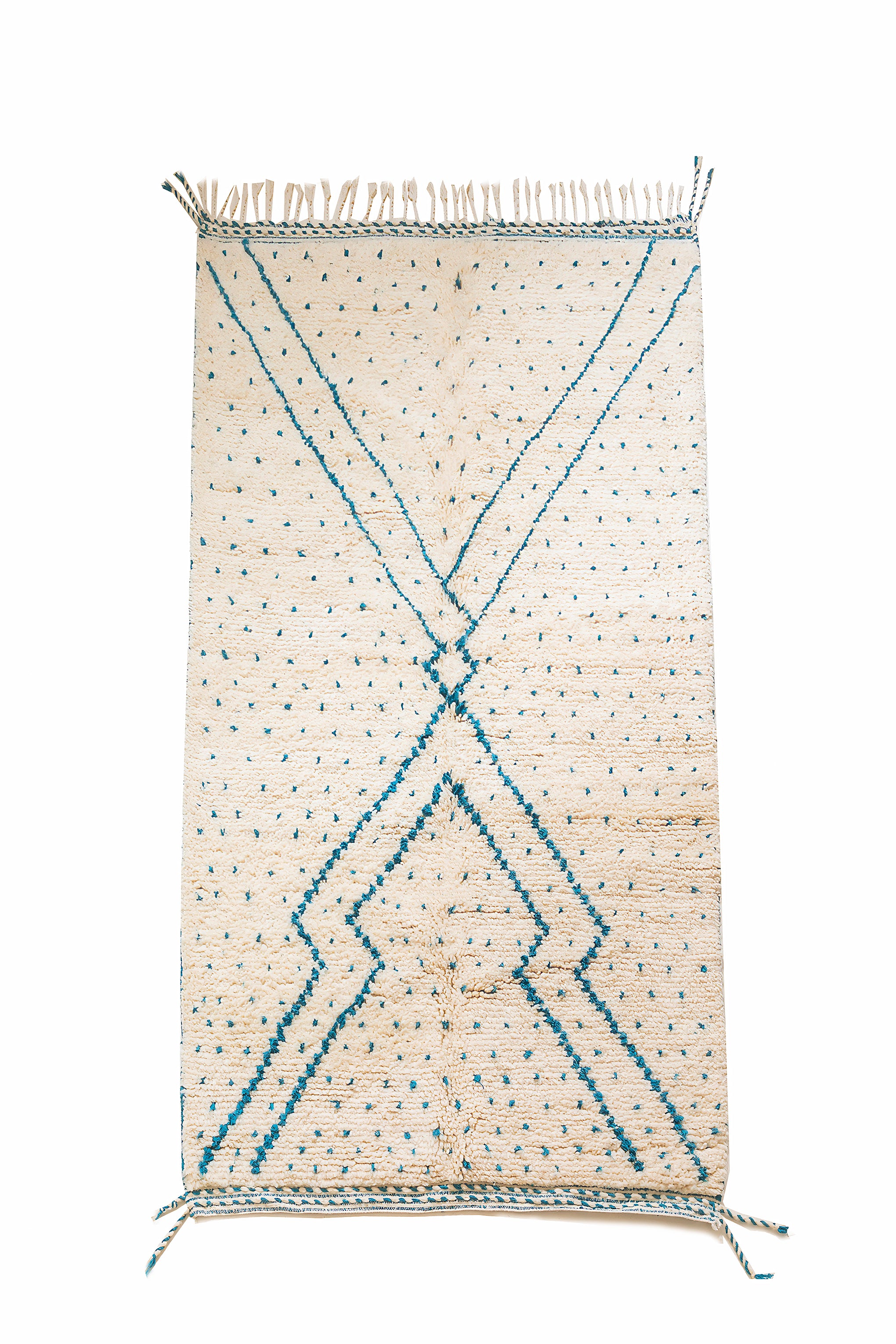Alfombra Beni Ouarain hecha a mano 100% lana natural de alta calidad, fondo en color crudo con un patrón geométrico de hilos de color turquesa.