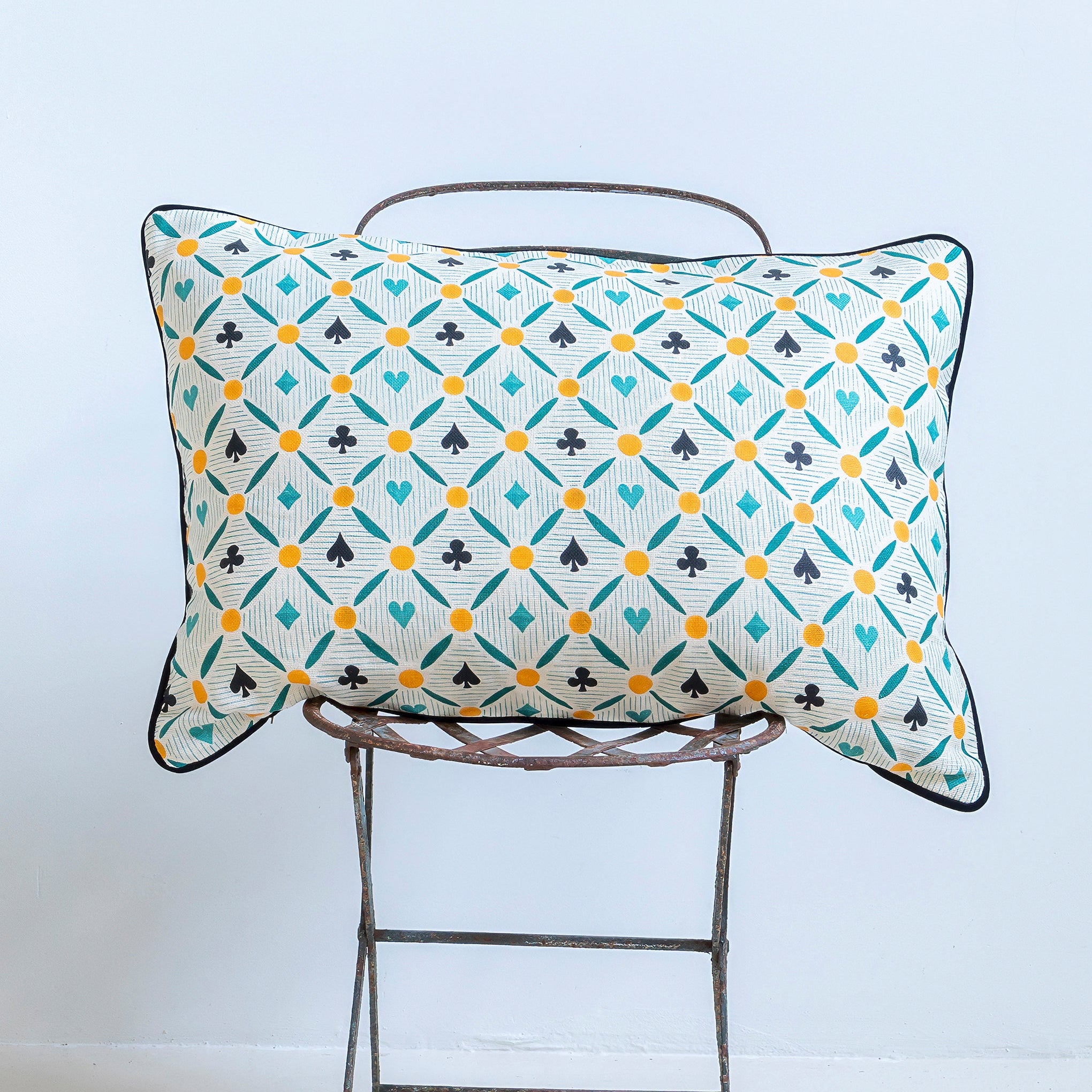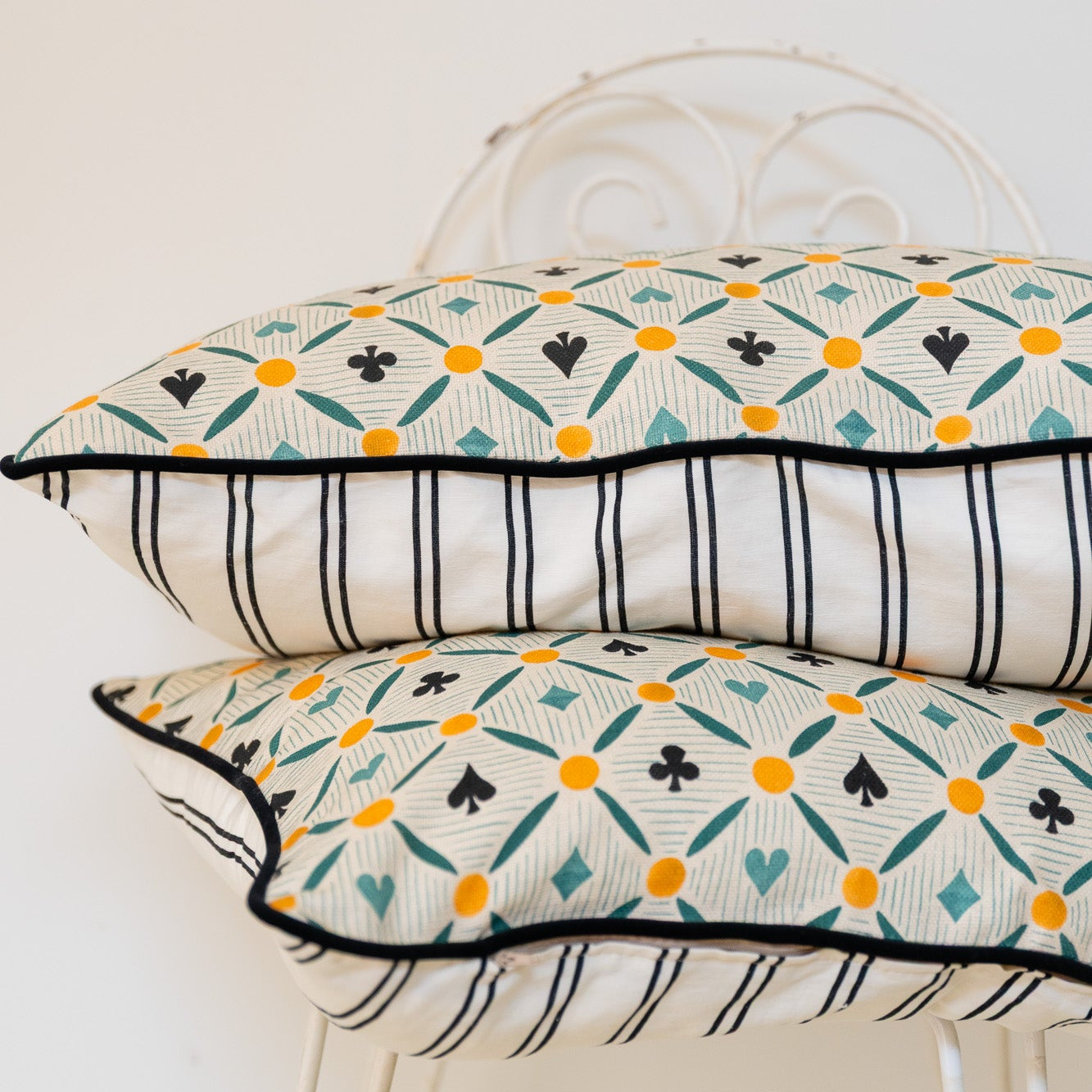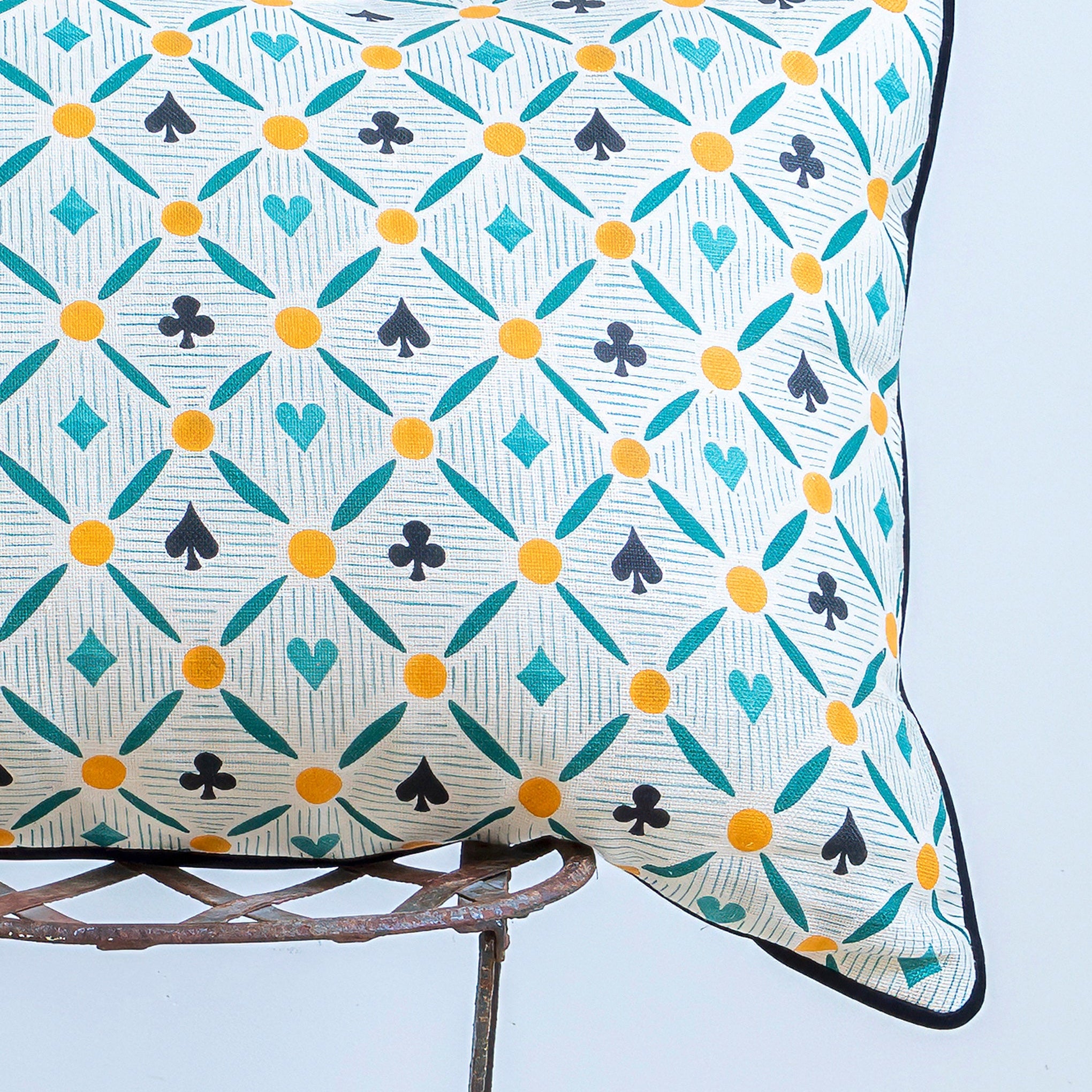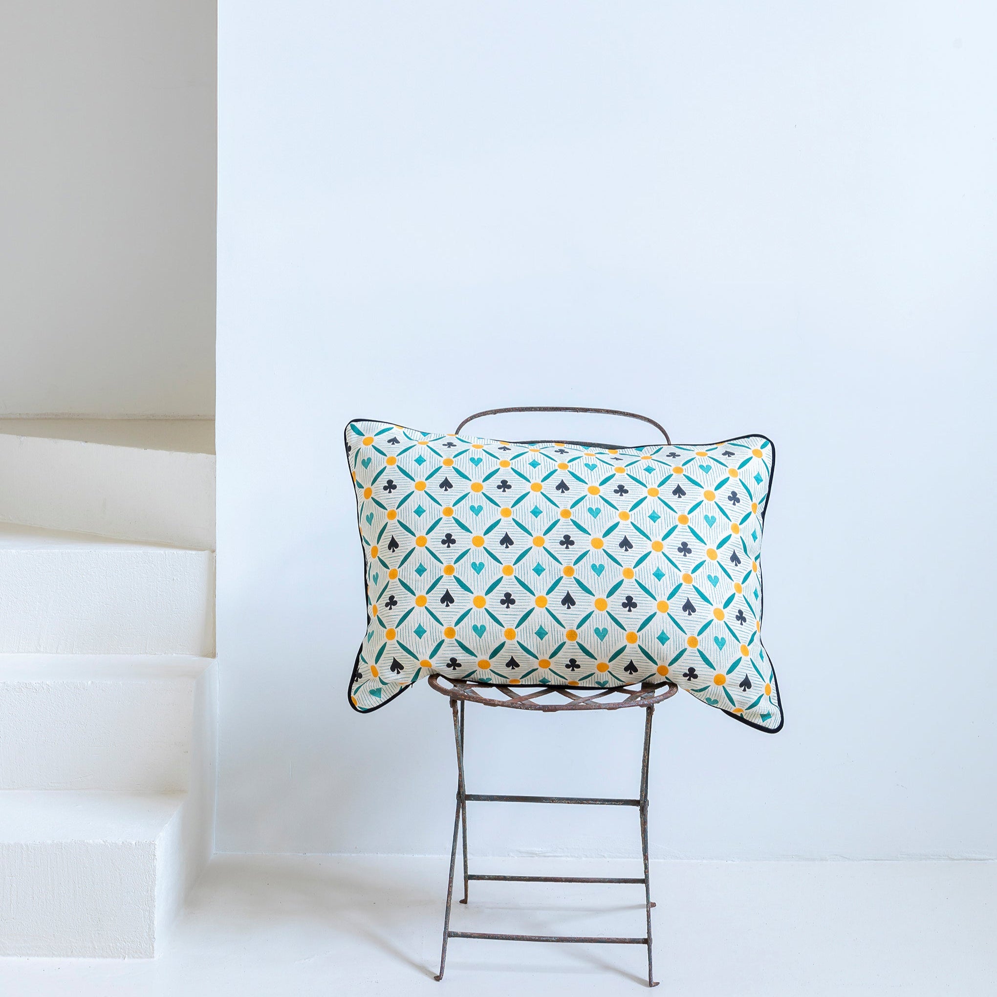 Cojín rectangular de algodón. Por una lado tiene una divertida decoración de naipes verde y amarillo, y por el otro lado unas discretas rayitas negras. Está rodeado por un bies en color negro, este detalle añade un toque de modernidad.
